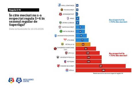 Federația Română de Fotbal a publicat statistica respectării regulii „5+6” până în acest moment, care presupune ca echipele să folosească, în cel puțin 75 la sută din meciuri, cinci jucători formați la nivel național sau eligibili pentru echipele naționale ale României.