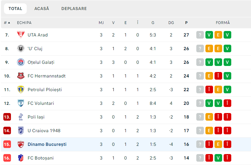 Elevii lui Zeljko Kopic sunt într-o situație critică. Fără victorie în play-out, Dinamo se află locul 15 în Superliga, la un punct în spatele ultimei poziții de baraj, ocupată de FCU Craiova.
