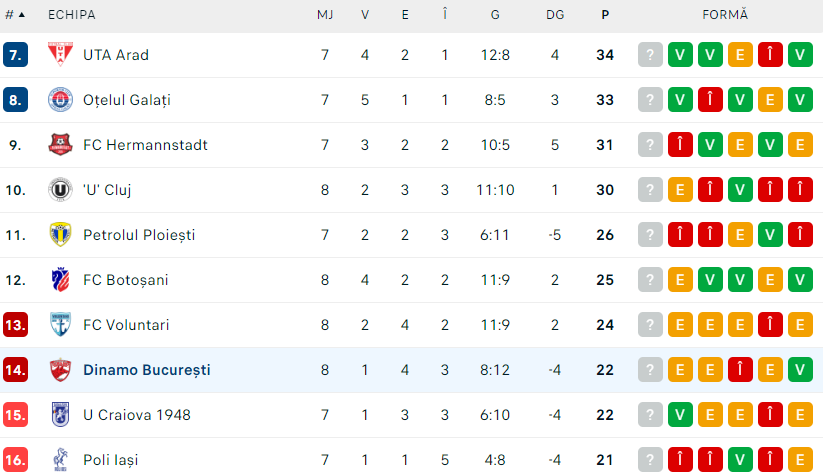 Elevii lui Zeljko Kopic se află la mâna rezultatelor pe care le vor înregistra celelalte echipe pentru a se salva de la retrogradarea directă. Dinamo are 22 de puncte și un meci în plus față de FC U Craiova și Politehnica Iași. Oltenii se află la egalitate de puncte cu „câinii roșii”, în timp ce moldovenii au 21 de puncte.