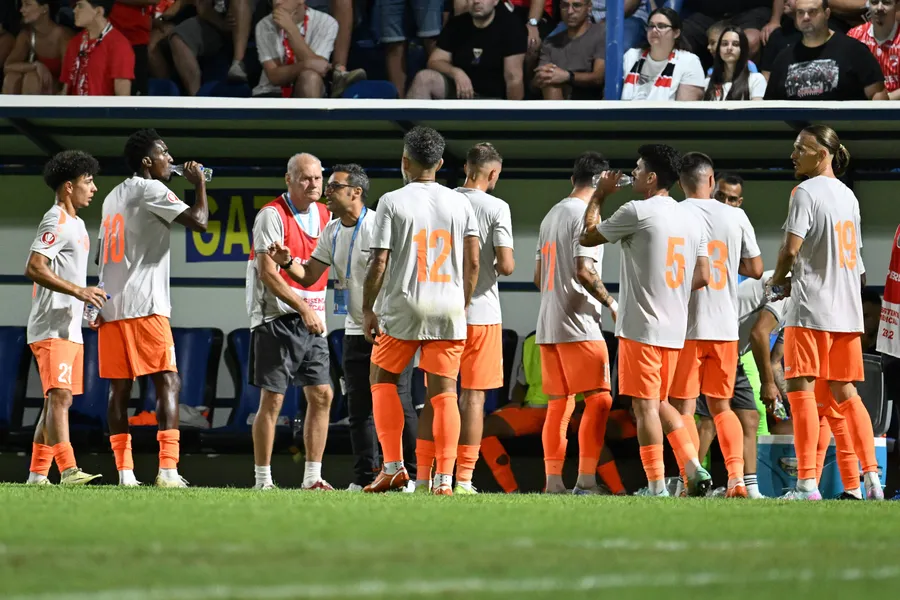Fotbalistii de la Metaloglobus la o fotografie de grup realizata inaintea meciului de fotbal dintre SC Otelul Galati si FC Metaloglobus Bucuresti, contand pentru Superliga Superbet, desfasurat pe Stadionul Otelul din Galati, luni 6 octombrie 2025. © FOTO:Sorin Pana/SPORT PICTURES