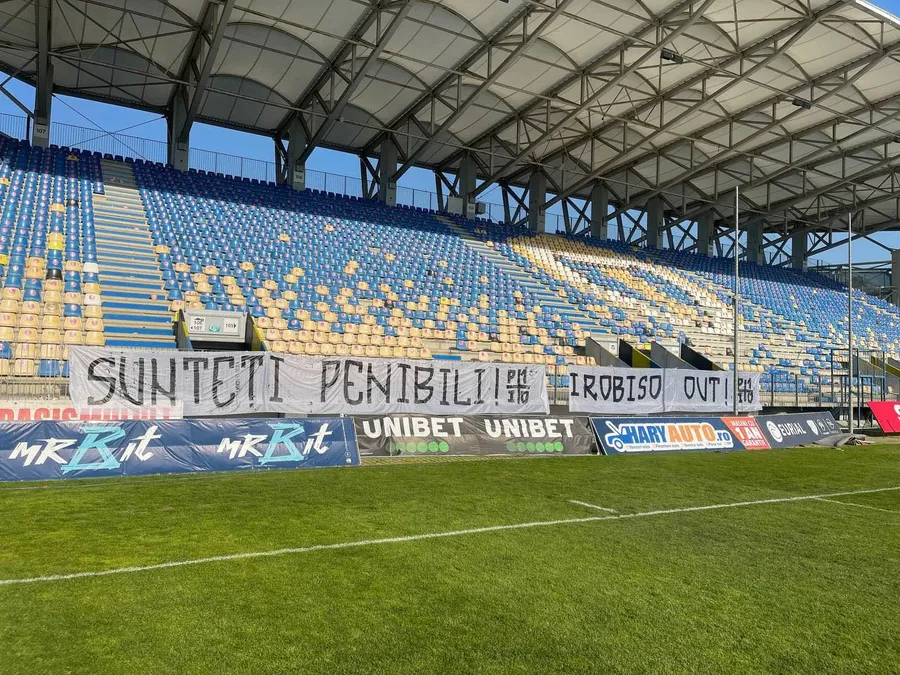 Ultrașii „lupilor” de la Peluza I „Ilie Oană” i-au luat la rost pe jucători afișând două bannere sugestive. Pe unul era mesajul „Sunteți penibili”, iar pe celălalt: „Irobiso OUT!”.