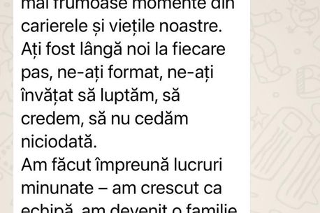 Am făcut împreună lucruri minunate, am crescut ca echipă, am devenit o familie și asta vi se datorează. Ați fost mai mult decât un antrenor. Ați fost un mentor, un frate mai mare, un om care ne-a inspirat în fiecare zi. Dacă plecați acum, simțim că se rupe ceva din noi. Vă rugăm, din suflet, nu renunțați la noi. Mai avem multe de construit împreună. Aveți toată încrederea și respectul nostru și, mai ales, recunoștința pentru tot ce ați făcut. Rămâneți cu noi, Mister, lupta noastră nu s-a încheiat!”