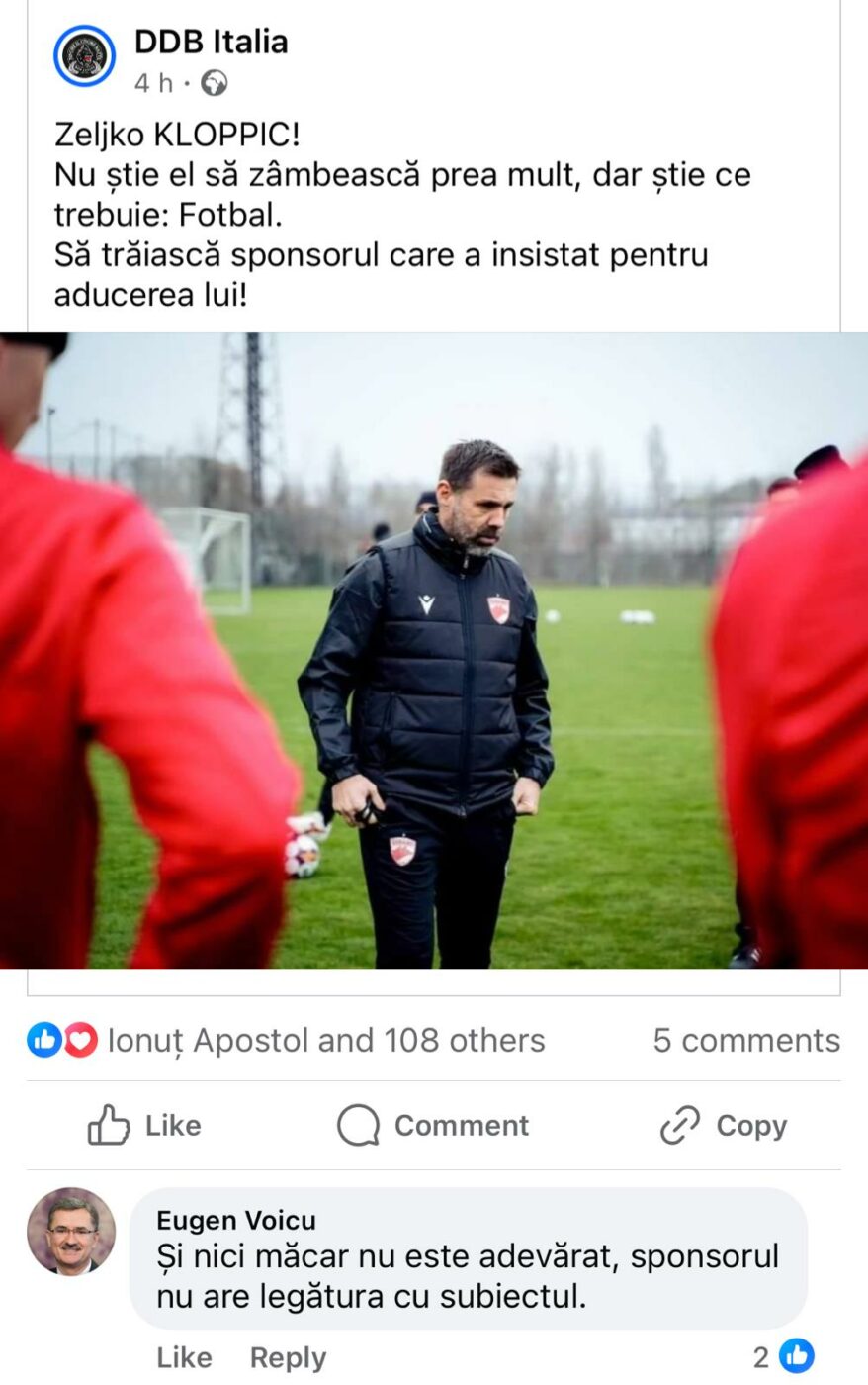 La Dinamo continuă telenovela „cine l-a recomandat pe Kopic?”. Totul a început cu deja celebra întrebare formulată de una dintre jurnalistele acreditate la conferința de presă în care tehnicianul a fost prezentat: „L-ați căutat pe Google, cum l-ați ales?”. Ultimul episod s-a consumat sâmbătă, atunci când Eugen Voicu, acționarul Red&White și președintele consiliului de administrație al acționarului majoritar al SC Dinamo 1948 SA, a reacționat în urma unei postări pe care administratorii paginii DDB Italia i-au dedicat-o antrenorului croat.