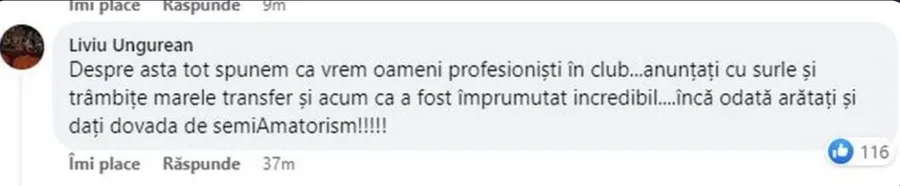De asta tot spunem că vrem oameni profesioniști în club… Anunțați cu surle și trâmbițe marele transfer și acum anunțați că a fost împrumutat, incredibil! Încă o dată, arătați și dați dovadă de semi-amatorism”, a fost reacția dură a lui Liviu Ungurean, zis și „Bocciu”, liderul de galerie de la Rapid.
