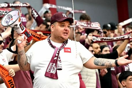 Liderul galeriei rapidiste Liviu Ungurean, alias Bocciu, canta alaturi de galerie dupa meciul de fotbal dintre Rapid Bucuresti si CFR Cluj, din cadrul Superligii Superbet, desfasurat pe Superbet Arena-Giulesti din Bucuresti, luni 25 septembrie 2023.,Image: 810185621, License: Rights-managed, Restrictions: , Model Release: no
