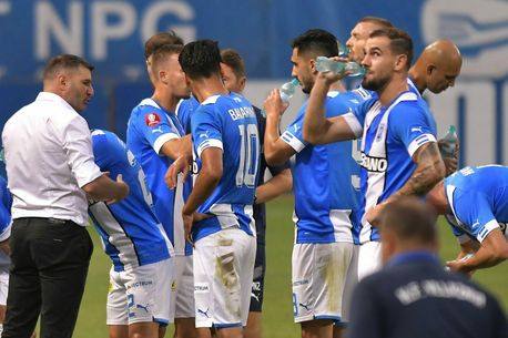 Laszlo Gyorgy Balint alaturi de fotbalistii craioveni Elvir Koljic si Andrei Virgil Ivan la o pauza de hidratare luata la meciul de fotbal dintre Universitatea Craiova si KF Vllaznia, din cadrul UEFA Europa Conference League, desfasurat pe Stadionul Ion Oblemenco din Craiova, joi 28 iulie 2022. © FOTO:Razvan Pasarica/SPORT PICTURES