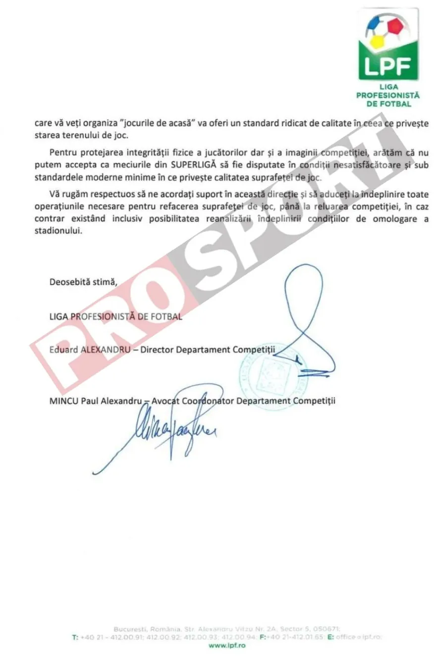 „Vă rugăm respectuos să ne acordați suport în această direcție și să aduceți la îndeplinire toate operațiunile necesare pentru refacerea suprafeței de joc, până la reluarea competiției, în caz contrar existând inclusiv posibilitatea reanalizării îndeplinirii condițiilor de omologare a stadionului”, se arată în finalul documentului trimis de către reprezentații LPF.