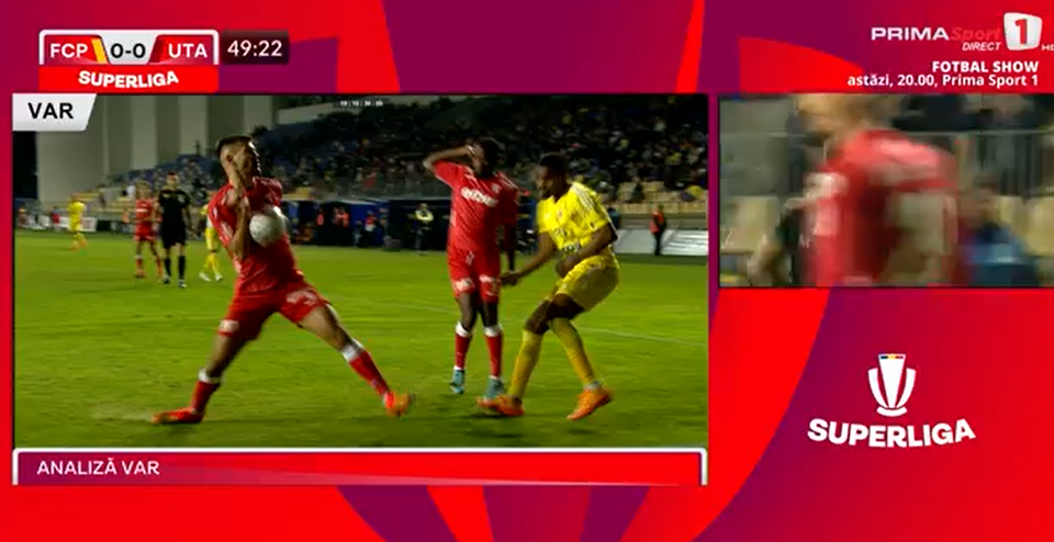 Decizie corectă: penalty fără cartonaș galben. Jucătorul își mărește suprafața corpului prin poziția mâinii și blochează o centrare. Conform instrucțiunilor fiind vorba de centrare nu se acordă cartonaș galben. Marcel Bîrsan, aflat în cabina VAR, îl cheamă pe Marian Barbu să revadă faza și astfel se ia decizia corectă.