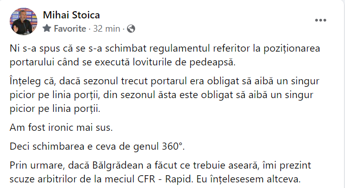 Prin urmare, dacă Bălgrădean a făcut ce trebuie aseară, îmi prezint scuze arbitrilor de la meciul CFR – Rapid. Eu înțelesesem altceva”, a scris Meme Stoica pe contul său de Facebook.