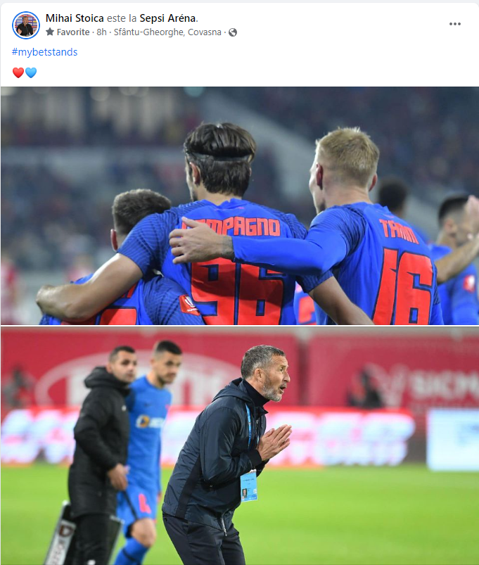 După ce FCSB a învins-o pe Sepsi OSK, scor 1-0, Meme Stoica a postat un mesaj pe contul său de Facebook prin care le reamintește contestatarilor ce pariu a pus. „My bet stands” (n.r. pariul meu rămâne în picioare).