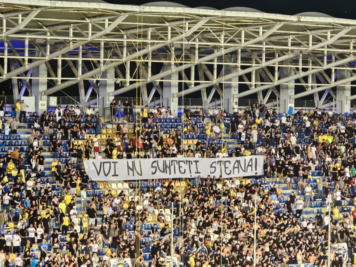Galeria celor de la Petrolul a avut o scenografie impresionantă înainte de startul meciului. În tribune a apărut și un mesaj care îl va face pe Florin Talpan să zâmbească. Fanii „lupilor galbeni” au afișat pe un banner mesajul „Voi nu sunteți Steaua”.