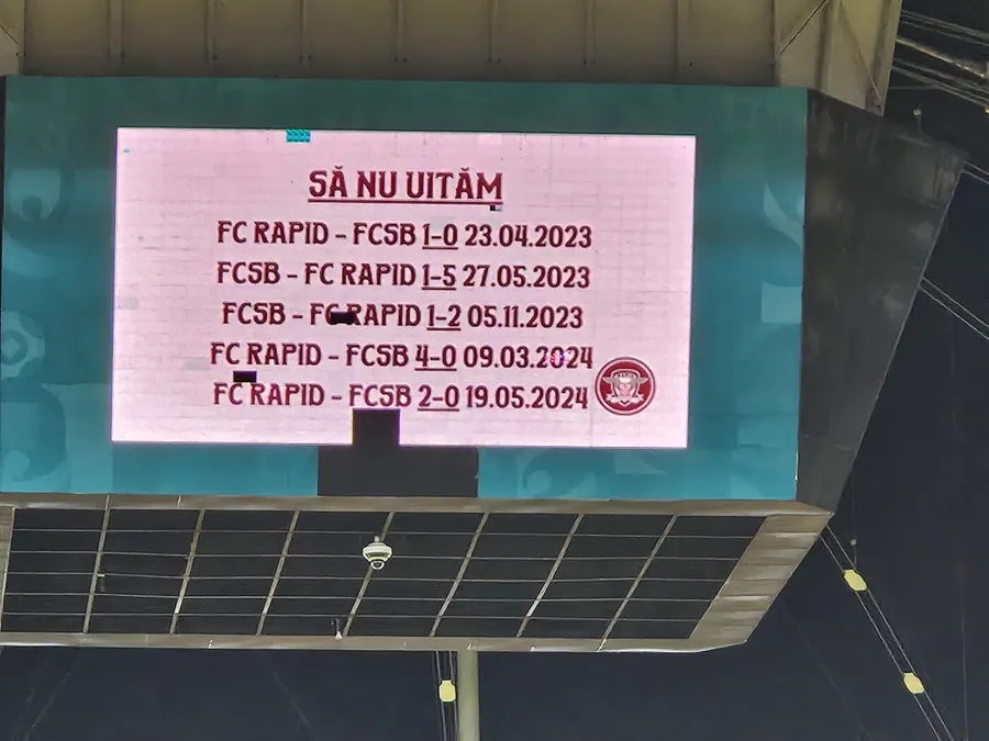 La finalul confruntării de pe Arena Națională, când în tribune au rămas, conform regulamentului, doar suporterii de la FCSB, organizatorii au afișat un mesaj ironic pe tabela de marcaj. Cei de la Rapid au prezentat rezultatele mai multor partide, care au răsucit cuțitul în rana rivalilor.