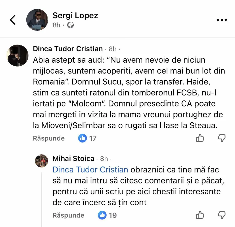 Domnule președinte CA, poate mai mergeți în vizită la mama vreunui portughez de la Mioveni/Șelimbăr să o rugați să-l lase la Steaua”, a fost comentariul lăsat de un fan al celor de la FCSB.
