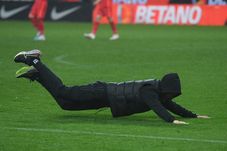 Oficialul vicecampioanei României a pătruns pe gazon imediat după ultimul fluier al „centralului” Marcel Bîrsan, iar atunci când a ajuns în fața peluzei a încercat să plonjeze într-o alunecare pe burtă către ei, un gest întâlnit uneori pe terenul de fotbal în momente de bucurie.