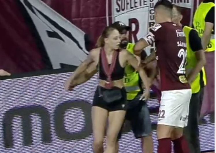 După ce au tras câteva minute de tânăra fană a formației Rapid București pentru a o da afară de pe suprafața de joc, Cristi Săpunaru, căpitanul grupării din Giulești, a intervenit pentru a o elibera.