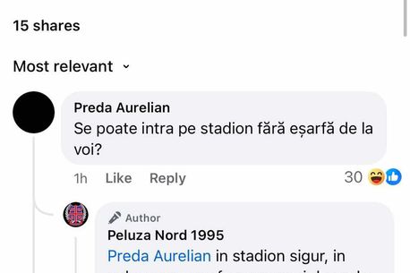 „Se poate intra pe stadion fără eșarfă de la voi?”, a dorit să știe un suporter al FCSB, iar răspunsul a venit imediat. „În stadion sigur, în peluză nu. Eșarfa o cumperi de unde vrea mușchiul tău, important este să o ai. Alte probleme?”, au transmis administratorii paginii Peluzei Nord.