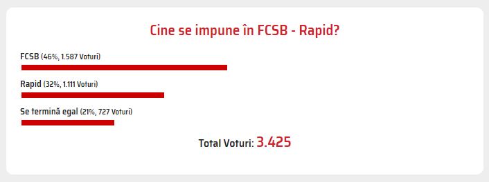 46% dintre votanți, adică 1.587 de persoane, au fost de părere că FCSB se va impune în derby-ul cu Rapid București. De cealaltă parte, 32% dintre cei care au participat la acest sondaj, adică 1.111 persoane, au votat în favoarea grupării giuleștene.