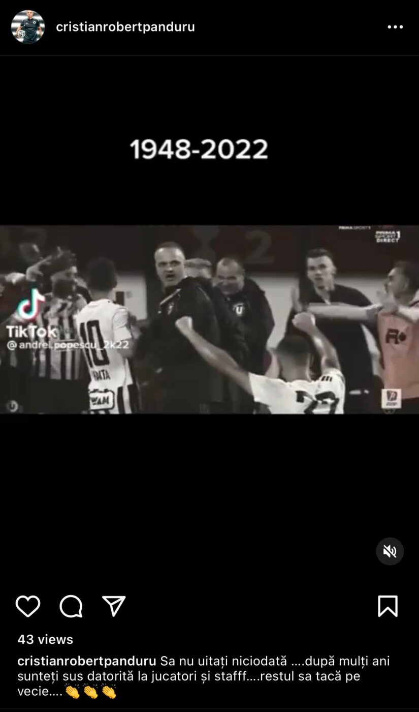 „Să nu uitați niciodată: după mulți ani, sunteți sus datorită jucătorilor și a staff-ului tehnic. Restul să tacă pe vecie”, a fost mesajul transmis de preparatorul fizic al lui U Cluj, Cristian Panduru, prin intermediul rețelelor de socializare.