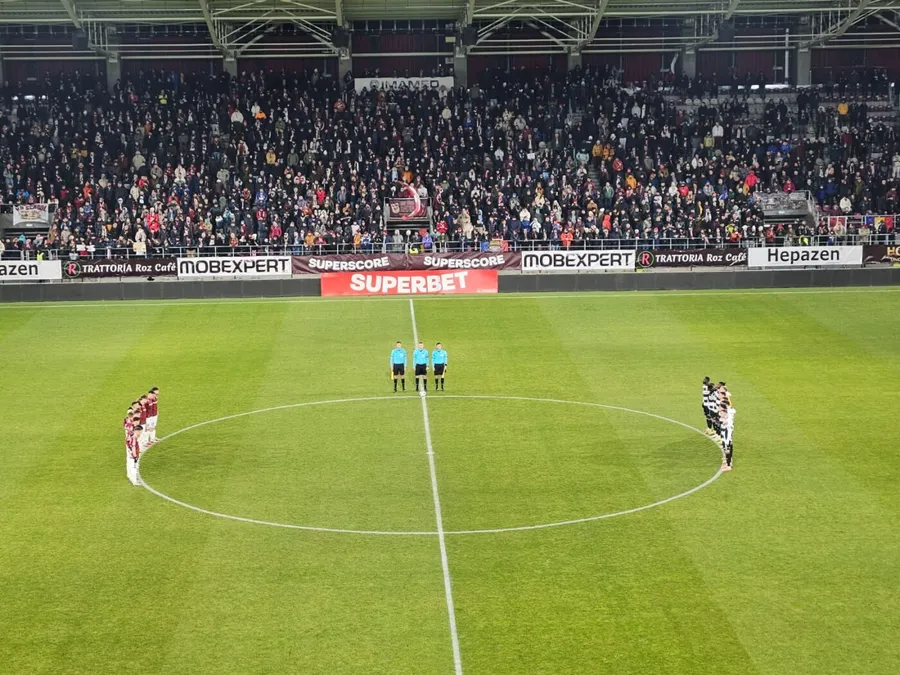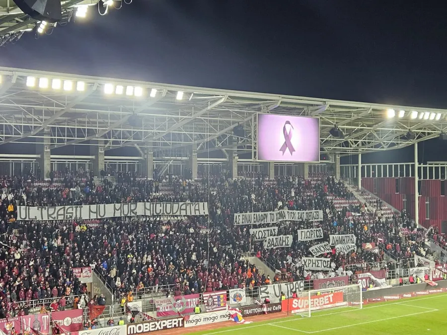 Echipele au ținut un moment de reculegere în memoria victimelor de la Lugojel. Fanii Rapidului au transmis un mesaj în limba greacă.