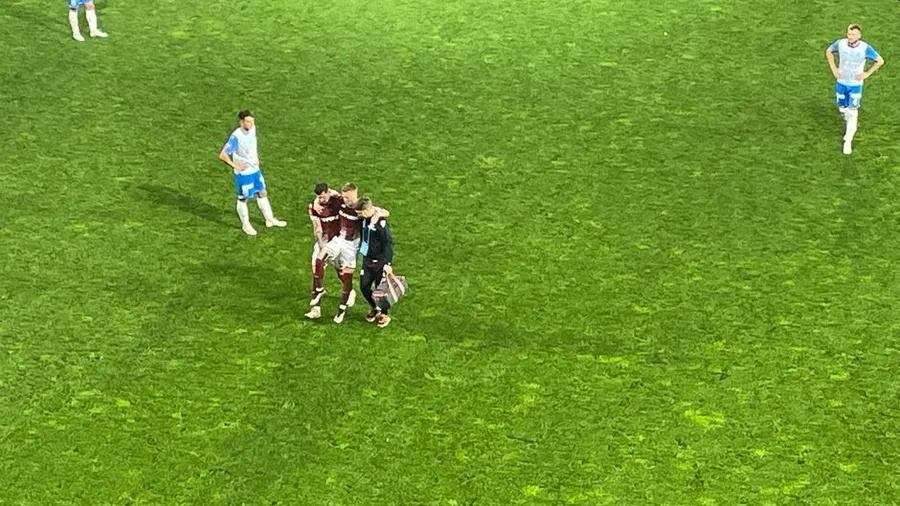 Claudiu Petrila cade după ce s-a întins după minge și acuză dureri musculare la coapsa stângă. Acesta este scos de pe teren cărat pe brațe de către Albu și unul dintre oamenii din staff, iar giuleștenii sunt nevoiți să schimbe.