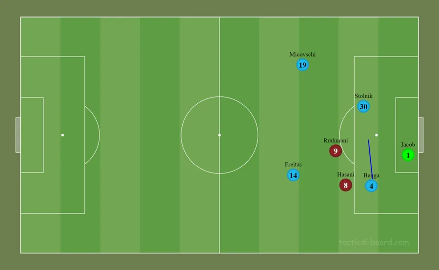 Dincolo de faptul că pasa executată greșită s-a oprit aproape de punctul cu var, în fața lui Rrahmani, la jumătatea distanței spre Stolnik, de ce nu pasat spre o degajare a portarului Iacob, dar mai ales de ce nu a eliberat zona mult mai ușor, la experiența lui, fie schimbând banda spre un Micovschi liber, fie degajând aproape, peste Hasani, unde coechipierul Freitas era, la fel, liber?