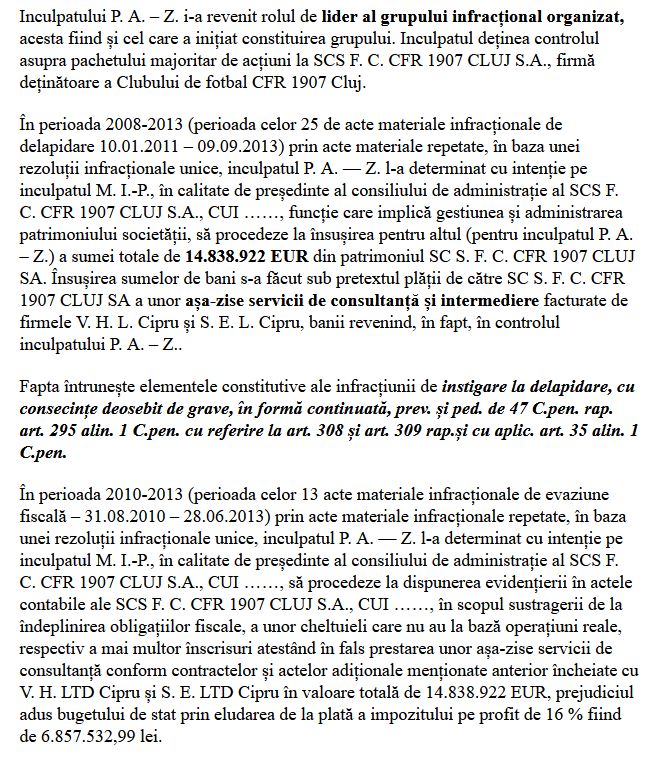 Siteul clujust.ro a publicat un document detaliat în care procurorii DIICOT Cluj arată cum opera grupul infracțional. Cei doi foști oficiali ai CFR Cluj sunt acuzați de delapidare, evaziune fiscală și spălare de bani.