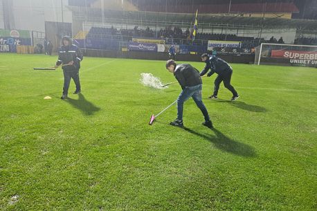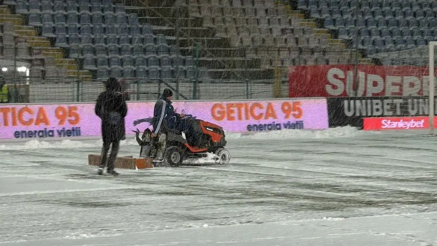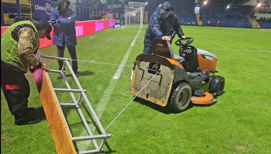 După ce bărbații înarmați cu teuri s-au luptat minute bune cu gazonul devenit o veritabilă mlaștină, arbitrii și echipele au ieșit pe teren. Primii cu inspecția gazonului, ceilalți cu încălzirea. Și, din câte se pare, „fluierașii” în frunte cu Rareș Vidican ar fi avut un ordin clar. Din lipsă de ore pentru a doua zi, când meciul ar fi trebuit reprogramat conform regulamentului,- și se pare că la presiunea deținătorilor drepturilor tv- mingea aruncată în sus… a sărit. Și nu prea. Nici nu prea mai conta. Trebuia să se joace!