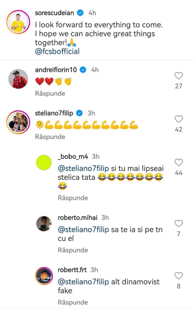 Noul fotbalist al vicecampioanei a făcut publică prima sa poză în tricoul roș-albastru prin intermediul rețelelor de socializare, însoțită de mesajul „Aștept cu nerăbdare tot ce urmează să vină! Sper că vom reuși lucruri importante împreună”. Steliano Filip, alături de care Deian Sorescu a jucat pentru Dinamo, a ținut să îl felicite pe fostul său coechipier pentru alegerea făcută printr-un comentariu plin de emoji-uri – din care au lipsit, însă, cuvintele.
