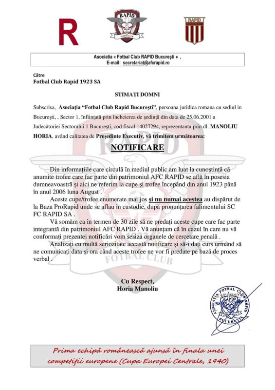 Vă somăm ca în termen de 30 zile să ne predați aceste cupe care fac parte integrantă din patrimoniul AFC RAPID. Vă anunțam că în cazul în care nu vă conformați prezentei notificări vom sesiza organele de cercetare penală. Analizați cu multă seriozitate această notificare și să-i dați curs urmând să ne comunicați data și ora când aceste trofee ne vor fi predate pe bază de proces verbal”, se anunță în notificarea emisă de Horia Manoliu.
