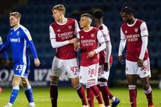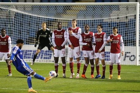 single club/league/player publications/services. The Arsenal defensive wall of Levi Laing (No 72), Nikolaj Moller (No 43), Zane Monlouis (No 89), Joel Lopez (No 49) and Catalin Cirjan (No 68) anxiously look on as Gillingham's Trae Coyle, currently on loan from Arsenal, takes a free-kick during Gillingham vs Arsenal Under-21, Papa John's Trophy Football at the MEMS Priestfield Stadium on 10th November 2020 Gillingham v Arsenal Under-21, Papa John's Trophy, Football, the MEMS Priestfield Stadium, Gillingham, Kent, United Kingdom - 10 Nov 2020,Image: 568368232, License: Rights-managed, Restrictions: EDITORIAL USE ONLY No use with unauthorised audio, video, data, fixture lists (outside the EU), club/league logos or "live" services. Online in-match use limited to 45 images (+15 in extra time). No use to emulate moving images. No use in betting, games or, Model Release: no