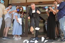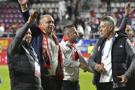 Patronul lui Sepsi OSK Sfantu Gheorghe Laszlo Dioszegi, Atilla Hadnagy si Cristiano Bergodi se bucura dupa castigarea Cupei Romaniei in urma meciului impotriva celor de la FC Voluntari, desfasurat pe Stadionul Rapid din Bucuresti, joi 19 mai 2022. © FOTO:Razvan Pasarica/SPORT PICTURES