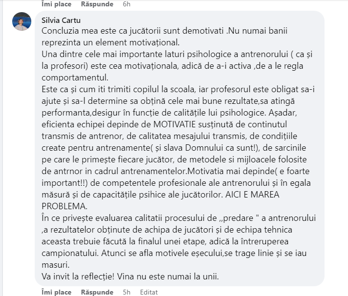 Este ca și cum îți trimiți copilul la școală, iar profesorul este obligat să-l ajute și să-l determine să obțină cele mai bune rezultate, să atingă performanța, desigur în funcție de calitățile lui psihologice. Așadar, eficiența echipei depinde de MOTIVATIE susținută de conținutul transmis de antrenor, de calitatea mesajului transmis, de condițiile create pentru antrenamente ( și slavă Domnului că sunt!), de sarcinile pe care le primește fiecare jucător, de metodele și mijloacele folosite de antrenor în cadrul antrenamentelor. Motivația mai depinde ( e foarte important!!) de competențele profesionale ale antrenorului și în egală măsură și de capacitățile psihice ale jucătorilor. AICI E MAREA PROBLEMA.