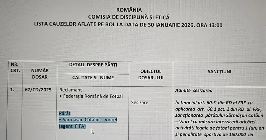 Vineri, Comisia de Disciplină, care a rămas în pronunțare încă de la sfârșitul lui 2025, a anunțat sentința lui Cătălin Sărmășan, cel care, conform informațiilor obținute de ProSport, ar fi avut conturi deschise pe mai multe platforme de mai bine de 10 ani, pe care ar fi jucat fervent în ultimii cinci, perioadă în care a rulat sume colosale, pe mii de pariuri puse pe meciuri de fotbal din Superliga, Liga 2, Liga 3. Multe dintre evenimente au fost chiar pe meciuri în care  evoluau și fotbaliștii reprezentați de el.