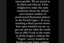 „Comentariile voastre sunt de neacceptat. Suntem mândri că suntem de culoare şi africani. Aş fi încântată să fac aceleaşi comentarii despre numărul aproape inexistent de jucători români din Ligue 1.