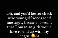 A, și mai bine ați verifica mesajele trimise de către prietenele voastre, pentru că se pare că româncelor le-ar plăcea să fie cu «negrul» meu”, a scris soția lui Joyskim Dawa, pe Instagram.