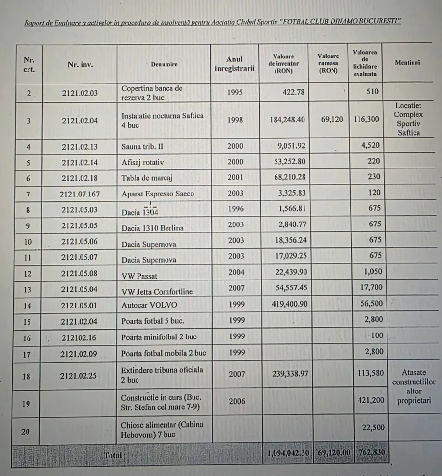 ProSport a consultat „Raportul de evaluare preliminar al activelor ACS FC Dinamo” pe care adminsitratorul judiciar l-a depus, în 2019, în dosarul de insolvență al asociației.