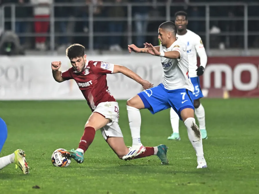 Paul Alexandru Iacob si Rivaldinho (Mosca Rivaldo Vitor Ferreira) in meciul de fotbal dintre Rapid Bucuresti si Farul Constanta, din cadrul Play-off-ului Superligii Superbet, desfasurat pe Superbet Arena-Giulesti din Bucuresti, vineri 15 martie 2024. © FOTO:Razvan Pasarica/SPORT PICTURES