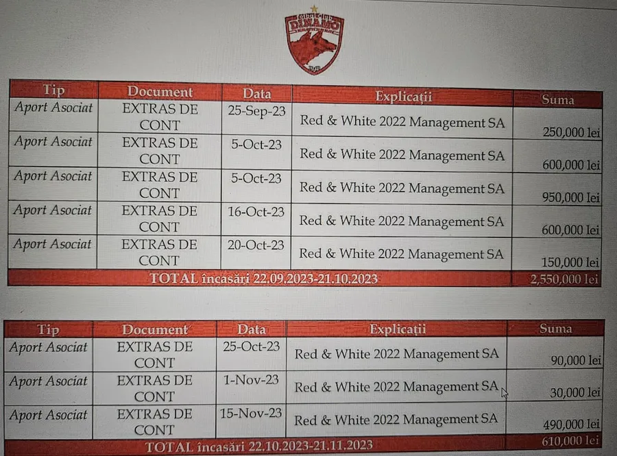 În aceeași zi, 7 septembrie, contul SC Dinamo 1948 SA a fost alimentat cu o sumă importantă: 550.000 euro, prin intermediul a cinci rate virate.