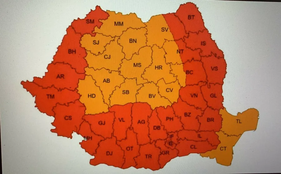 Pentru sâmbătă, 13 iulie, și duminică, 14 iulie, situația devine acută. Administrația Națională de Meteorologie a emis deja cod ROȘU de caniculă pentru 28 de județe și București, doar celelalte rămânând sub cod portocaliu! Iată cum se prezintă harta oficială: