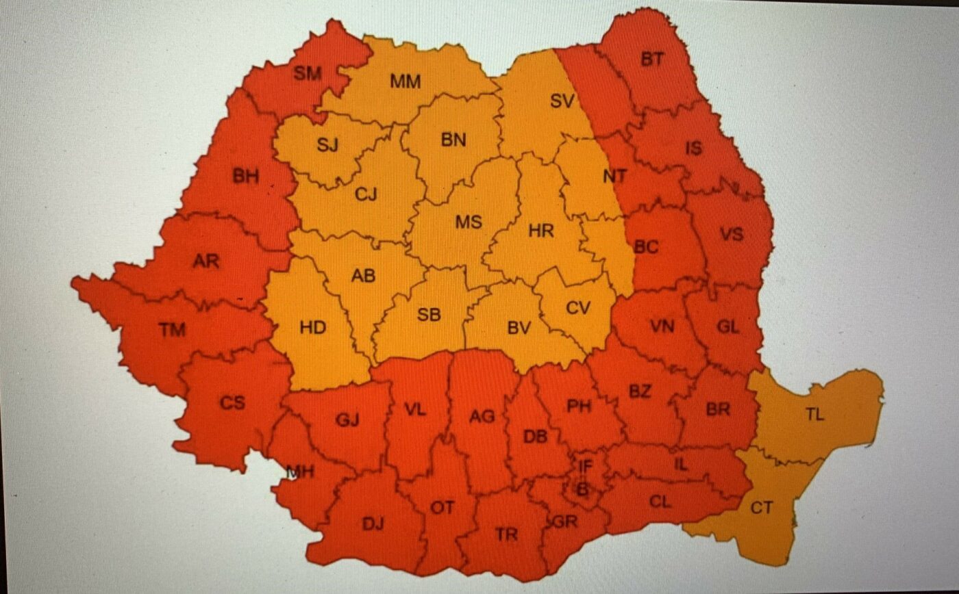 Sunt sub cod galben doar județele Maramureș, Bistrița-Năsăud, Harghita și Covasna, unde nu avem astăzi meciuri!, plus porțiuni mici din Suceava, Neamț, Bacău, Tulcea și Constanța.