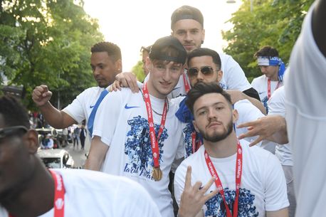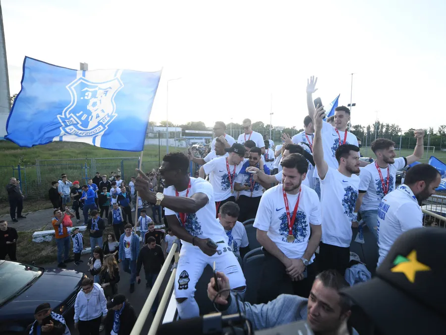 Fotbalistii Farului Enagnon David Kiki, Alexandru Buzbuchi, Tudor Cristian Baluta, Alexandru Buzbuchi si Roberto Carlo Casap se bucura alaturi de suporteri in turul de onoare al orasului Constanta, efectuat intr-un autocar supraetajat, luni 22 mai 2023. © FOTO:Razvan Pasarica/SPORT PICTURES
