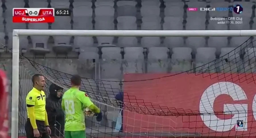 Min. 70: Problema a fost rezolvată! Cei din staff-ul lui U Cluj au lipit plasa cu banda adezivă! Arbitrul a reluat partida.