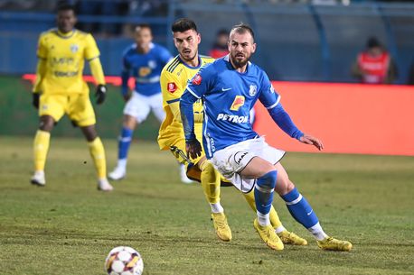 George Cimpanu (C), de la CS Universitatea Craiova, suteaza in timpul meciului de fotbal contra echipei FCU Craiova 1948 din etapa a XXVI-a a Ligii 1, disputat pe stadionul Ion Oblemenco din Craiova, luni, 14 februarie 2022. REMUS BADEA / MEDIAFAX FOTO
