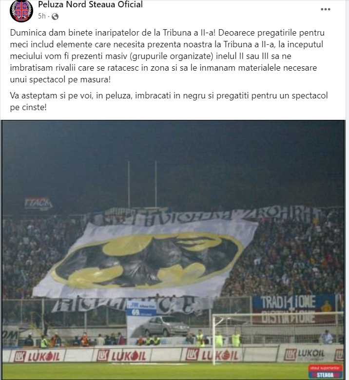 „Duminică dăm binețe înaripatelor de la Tribuna a II-a! Deoarece pregătirile pentru meci includ elemente care necesită prezența noastră la Tribuna a II-a, la începutul meciului vom fi prezenți masiv (grupurile organizate) inelul II sau III să ne îmbrățișăm rivalii care se rătăcesc în zonă și să le înmânăm materialele necesare unui spectacol pe măsură! Vă așteptăm și pe voi, în peluză, îmbrăcați în negru și pregătiți pentru un spectacol pe cinste!”, este mesajul rasist postat de fanii FCSB pe Facebook.