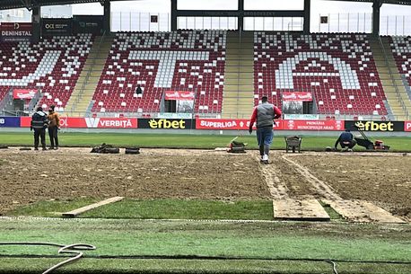 La această oră, la arena „Francisc Neuman” 15 angajați ai Reconsului (firma ce administrează stadionul din Arad) lucrează la schimbarea gazonului pe porțiuni mari, până aproape de centrul terenului, dar și în cele două careuri. Până ieri, s-a decapat gazonul ce a aratat execrabil cu Rapidul, pe 18 decembrie, iar de azi se montează primele rulouri noi.
