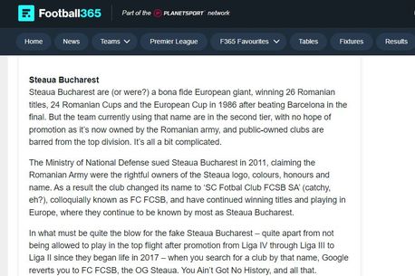Trebuie să fie o lovitură pentru falsa Steaua București – pe lângă faptul că nu i se permite să joace în prima ligă după promovarea în Liga 2, când cauți un club cu numele Steaua, Google te va duce la FC FCSB, originala Steaua. Nu ai nicio istorie până la urmă!”, se arată pe Football365.com.