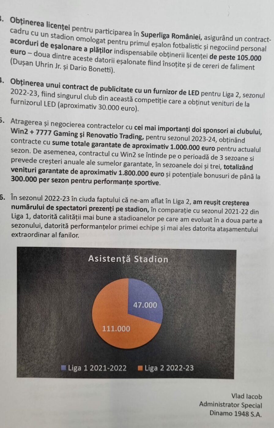 Timp de mai bine de un an, mi-am asumat un drum dificil. Pot spune că sunt pregătit să-mi închei mandatul cu mândrie, după performanța promovării, însă trebuie să rămân umil. Consider că Dinamo merită mai mult decât o simplă promovare și sunt conștient că, în contextul dat, nu am putut să îi ofer mai mult de atât. Eu voi continua să studiez și să-mi perfecționez competențele și sper ca, în viitor, să mai am ocazia să fac parte din conducerea acestui club.”, a mai transmis Vlad Iacob.