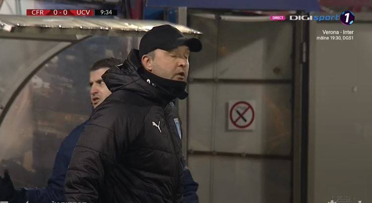 Au fost nervi încă din start la meciul CFR Cluj- Universitatea Craiova. Antrenorul Corneliu Papură a intrat pe teren, ca să protesteze și a primit cartonașul galben. Era minutul 10. Tehnicianul oltenilor a mai fost avertizat o dată și în finalul partidei și a fost trimis în tribună.