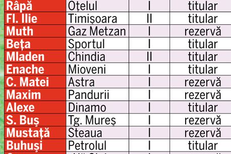 Râpă, Beța, Enache, Alexe. Ei patru încep de regulă meciurile echipelor lor de club aliniați la centrul terenului, ceilalți fie vin din ligi inferioare, fie la startul partidelor sunt în trening, pe bancă, fie, mai rău, în tribună. Dintre cei patru, OK ca statut sunt doar Râpă, om de Champions League, și Alexe, component al liderului. Ceilalți doi, Enache și Beța, sunt titulari la echipe slabe, de coada clasamentului, Mioveni și Sportul. Buhuși, rezervă la Nantes, a evoluat în ultimele partide ale Petrolului, Muth apare la Mediaș când titularii de drept au probleme sau sunt odihniți, ca și Cosmin Matei la Astra sau Sergiu Buș la Tg. Mureș.