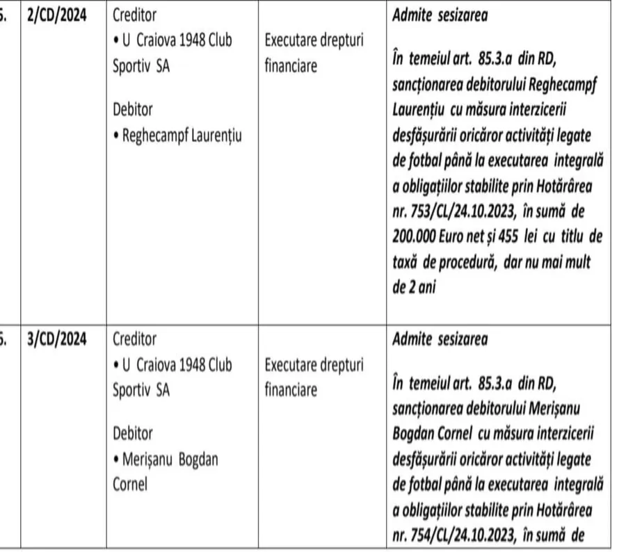 • „Admite sesizarea În temeiul art. 85.3.a din RD, sancționarea debitorului Merișanu Bogdan Cornel cu măsura interzicerii desfășurării oricăror activități legate de fotbal până la executarea integrală a obligațiilor stabilite prin Hotărârea nr. 754/CL/24.10.2023, în sumă de 7 100.000 Euro net și 455 lei cu titlu de taxă de procedură, dar nu mai mult de 2 ani”.
